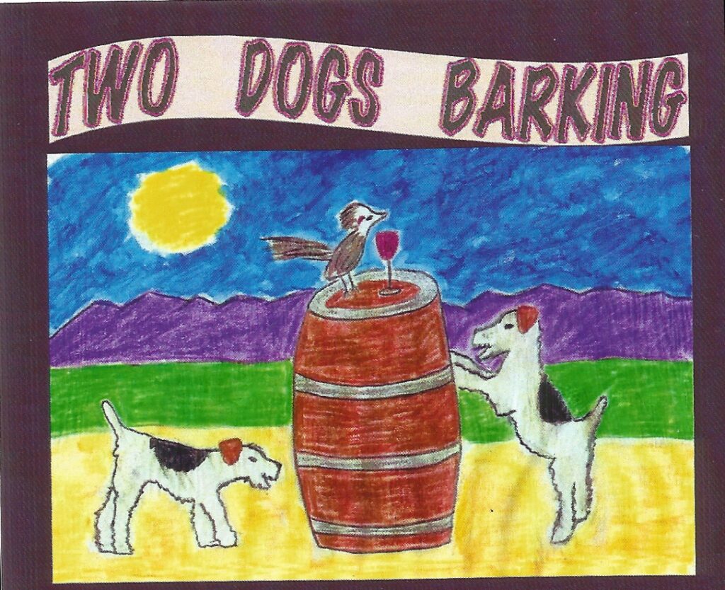 Our label for Two Dogs Barking means that we bought the grapes from a Ramona Valley vineyard and produced and bottled the wine here at Scaredy Cat Ranch.